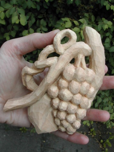 Grapes...inspired by a wonderful grapes carving, i saw ... I am happy with the design of the piece, not so much with the grapes themselves. There is room for improvement... 14cm high, 3,5cm deep. linden, untreated wood |
