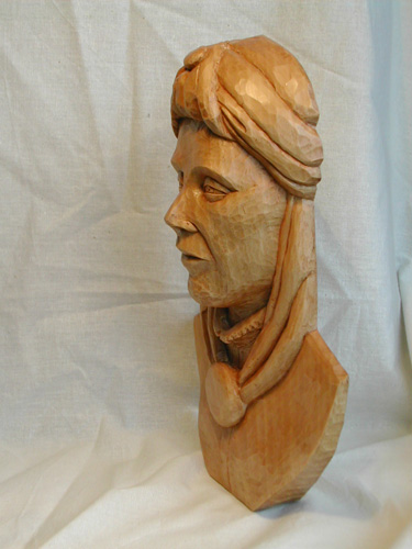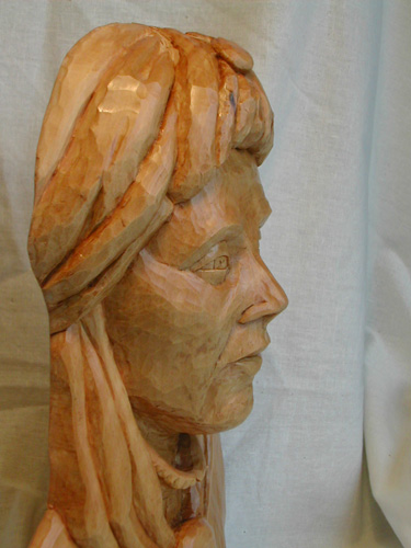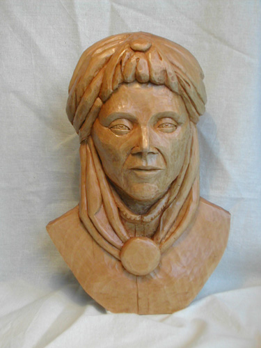 lady with turbanwith this carving i made the first attempt to carve from a clay model i previously made. i built me a simple pointing tool to measure depth, to help to get accuracy. she turned out slightly different, since i tried to correct errors from the clay model. in all, i am very happy with the feel of this carving. there is some information on how she was carved on my blog. linden, half lifesize, finish is a thin coat of clear matte varnish, followed from a light colored beewax glaze, followed by colored briwax |