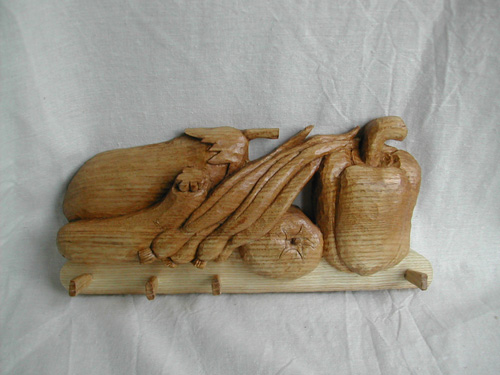 mediterranean vegetablethis little project started from a doodle which i liked so much i decided to turn it into something useful... and so, this board became on which i now can hang my kitchen towels... a short story of the carving is on my blog ... oak, 25cm wide, 10cm high, 3cm deep. finish is an oak stain on the vegetable part only, and then waxed. |