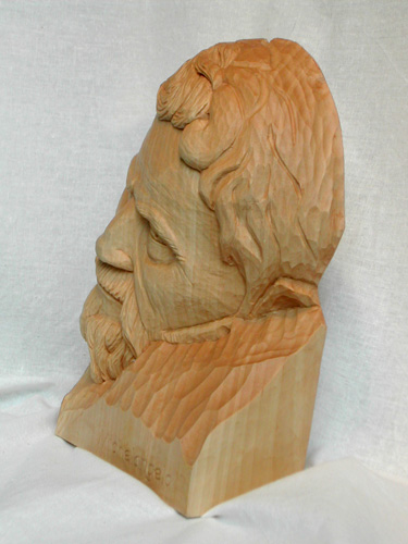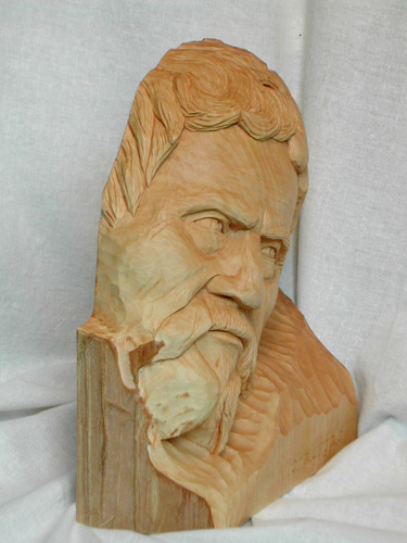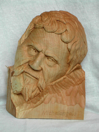 portrait of michelangelo buonarrotireading a new biography on michelangelo made me want try carving a portrait of him. since he lived about 500 years ago,no fotos of him exist. so, i based my portrait onto the few paintings artists have made while michelangelo lived (showing michelangelo in different ages as well), and a drawing, and a bronze sculpture of him .... furthermore i used the few selfportraits in the artwork he produced himself. my first step was studying this meager reference material, and ask myself if i think these representations show the same man... yes, i think they do, though they do differ in some aspects dramatically. so, my plan was, to try carve from this reference material a portrait, showing him how i see the man michelangelo was from the many biographies i have read of him, and from what i think i can read in his sculptures and fresko of the sixtine chapell... so what i ended up with, might very well not be any similar to the true michelangelo, but it will show how i imagine he was ... continue to read the story of how michelangelo was carved on my blog linden, almost lifesize, finish is a thin coat of clear matte varnish, followed from a light colored beewax glaze |